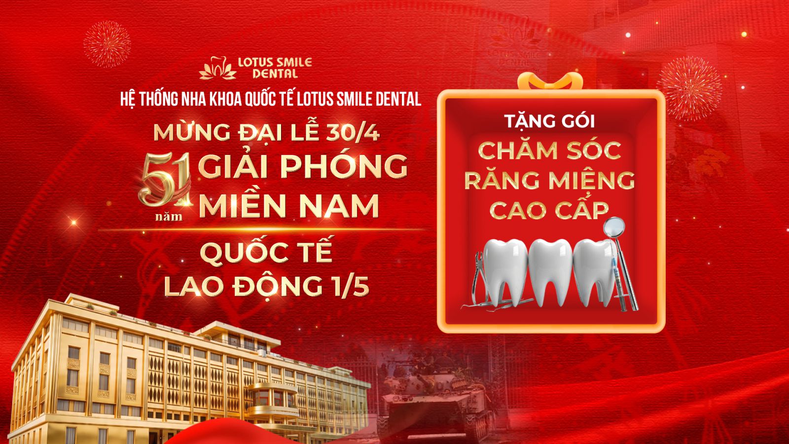 Hòa chung không khí tự hào của cả nước kỷ niệm ngày Giải phóng miền Nam 30/4 và Quốc tế Lao động 1/5, Hệ thống Nha khoa Quốc tế Lotus Smile Dental xin gửi tặng Quý khách hàng món quà tri ân đặc biệt để kỳ nghỉ lễ thêm trọn vẹn.